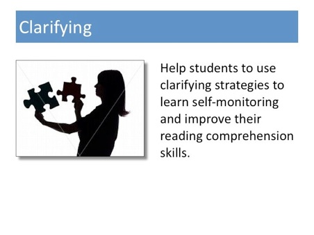 Clarifying belongs to a set of reading strategies called Collaborative Teaching, but it can also stand on its own. Clarifying is an umbrella term for a set of cognitive strategies that students can use to identify where they have comprehension difficulties and how they can get at the meaning of a word, phrase, sentence or passage. Students are encouraged to identify problem areas and consider specific fix-up or repair strategies when understanding breaks down. Clarifying strategies need to be adjusted for different kinds of texts and need to take into account a variety of reasons for comprehension difficulties (insufficient background knowledge, weak decoding skills, unfamiliar vocabulary, or general problems with gaining meaning from print).
