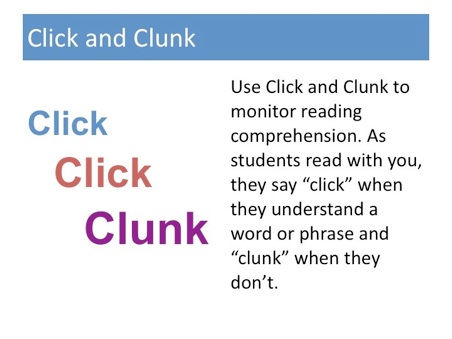 Click, Clunk is a teaching/learning strategy that students use to signal comprehension difficulties to themselves and the teacher. Students simply read silently and then say “click” for each word they understand (and again for each sentence or passage) and “clunk” whenever they encounter a word, phrase, sentence or passage that they don’t fully understand.