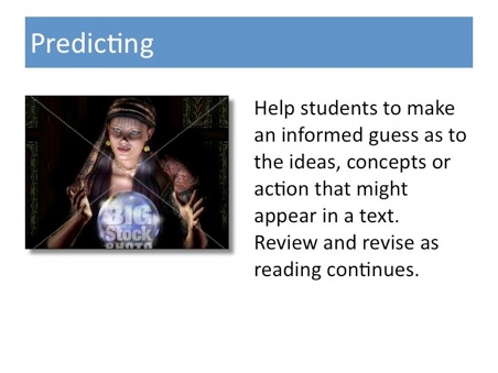 Predicting belongs to a set of strategies called Reciprocal Teaching or Collaborative Teaching. Predicting asks students to take in information (a headline or title, a picture, a summary, or a chart) and make an informed guess as to the ideas or concepts that might appear in a text. After making a prediction, students read or listen to a text and either confirm or revise their predictions.