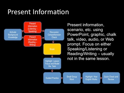 Present information orally or use just a few words on the board, flip chart, or PowerPoint. Do not start with a reading activity, even you are focusing on reading and writing. Repeat and reinforce the information you present in different ways and paraphrase. If possible, use different media to present information: PowerPoint, graphic, chalk talk, video, audio, or web page.