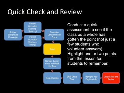 Do a quick review to make sure students understand the key points of the lesson. This could be done through a comprehensive check, quick pair practice on a language point, or by the teacher asking quick questions of every student related to the lesson.