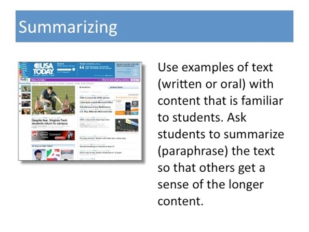Summarizing is part of a set of strategies called Reciprocal Teaching that involves peer interactions. Reciprocal teaching also includes predicting, question generating, and clarifying. Summarizing is a challenging task for most struggling learners, particularly English language learners, and is often preceded by practice in retelling and note taking. Summarizing requires that students get the gist of a reading and then distilling key points in the reading. Summarizing requires that students develop a shorter version of a longer piece that includes both the main points and essential details.